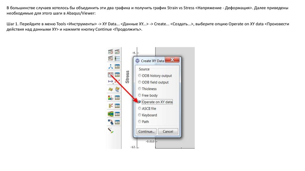 В большинстве случаев хотелось бы объединить эти два графика и получить график Strain vs Stress <Напряжение - Деформация>. Далее приведенынеобходимые для этого шаги в Abaqus/Viewer: