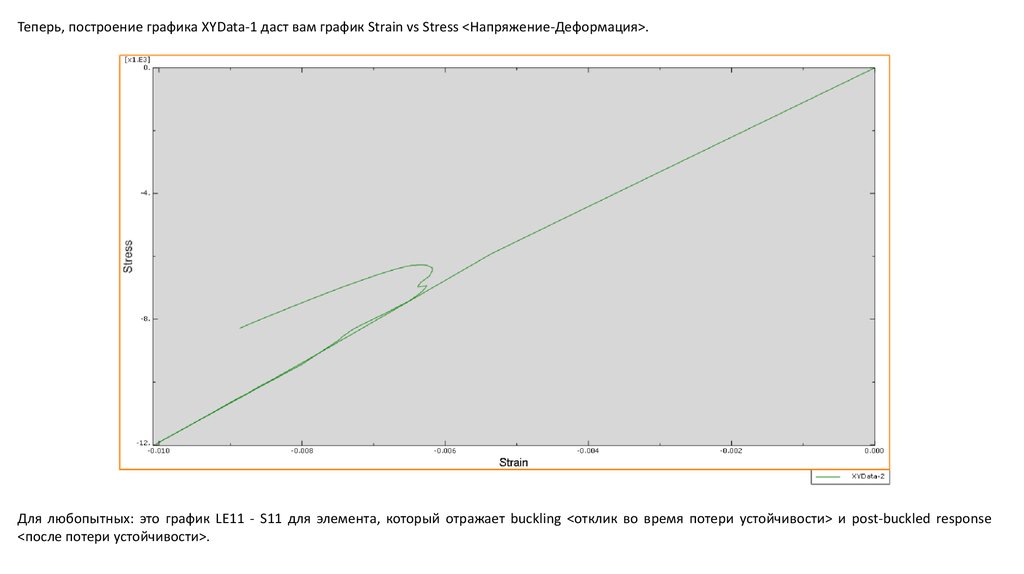 Теперь, построение графика XYData-1 даст вам график Strain vs Stress <Напряжение-Деформация>.Для любопытных: это график LE11 - S11 для элемента, который отражает buckling <отклик во время потери устойчивости> и post-buckled response