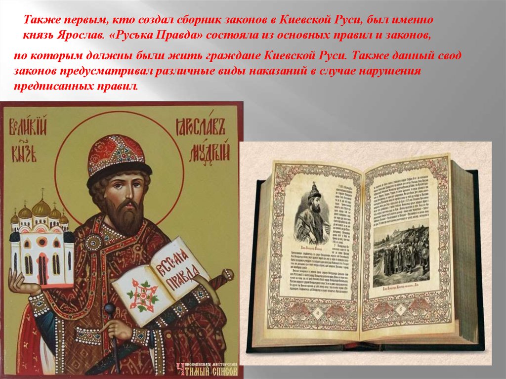 Также первым, кто создал сборник законов в Киевской Руси, был именнокнязь Ярослав. «Руська Правда» состояла из основных правил и законов,