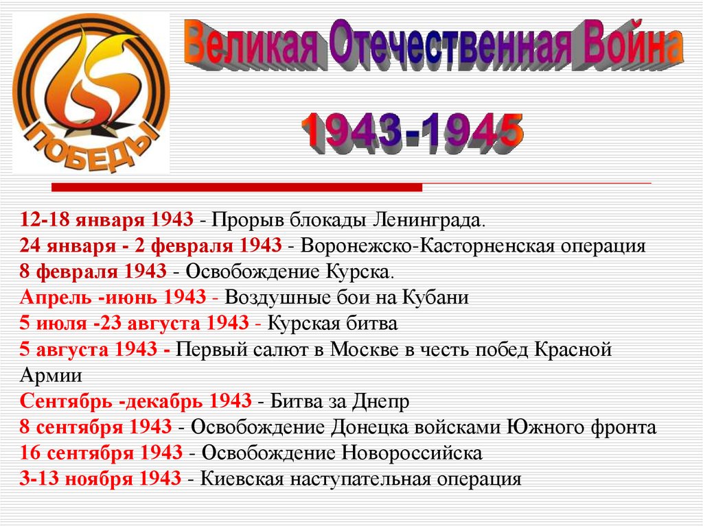 12-18 января 1943 - Прорыв блокады Ленинграда.24 января - 2 февраля 1943 - Воронежско-Касторненская операция