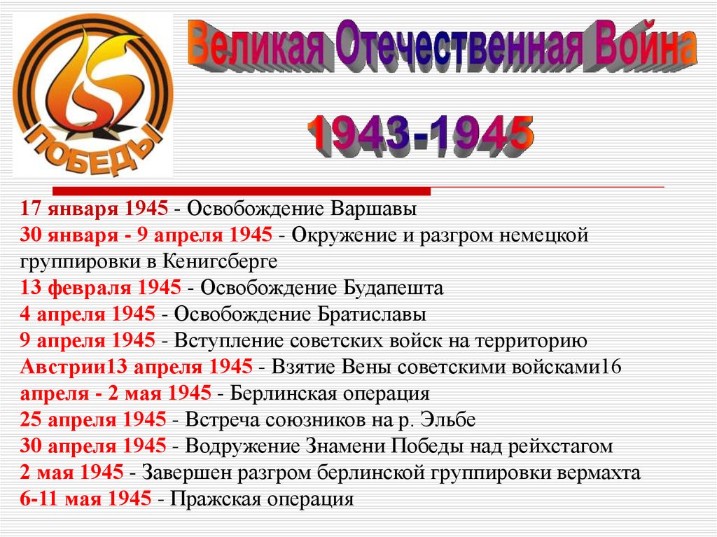 17 января 1945 - Освобождение Варшавы30 января - 9 апреля 1945 - Окружение и разгром немецкой