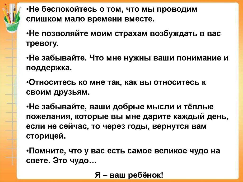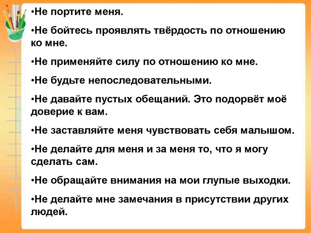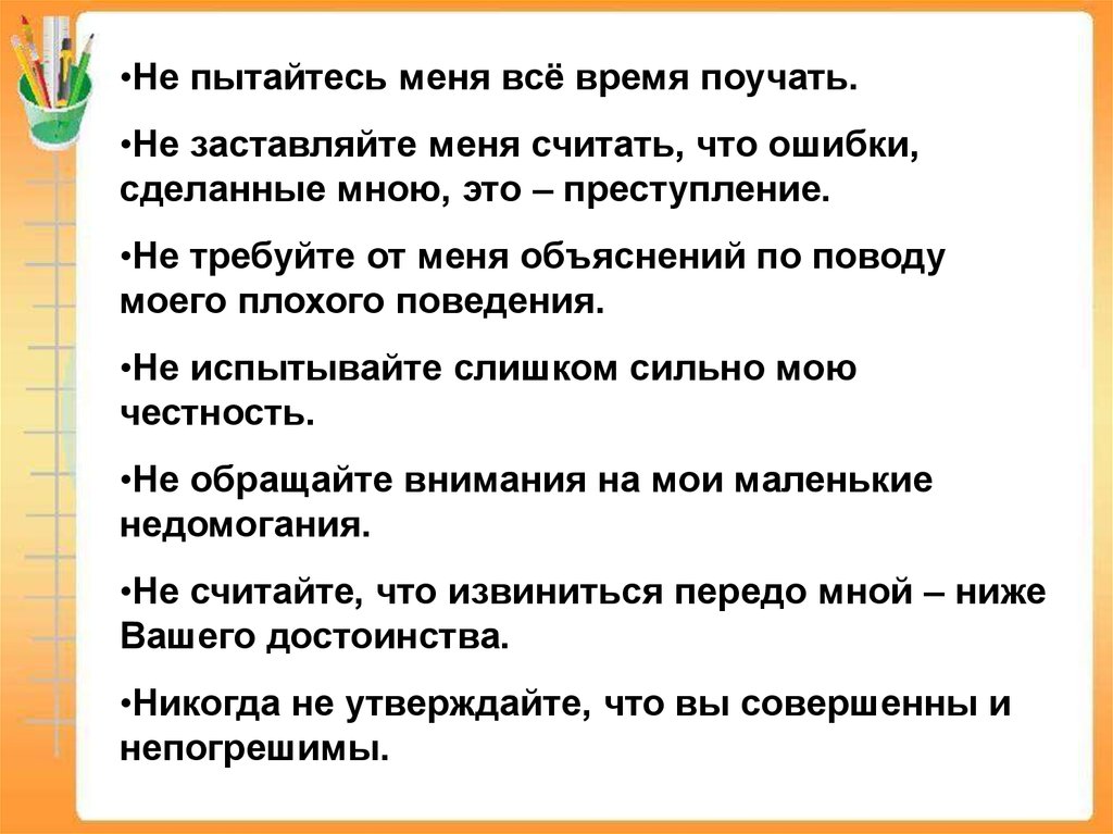 •Не пытайтесь меня всё время поучать.•Не заставляйте меня считать, что ошибки,