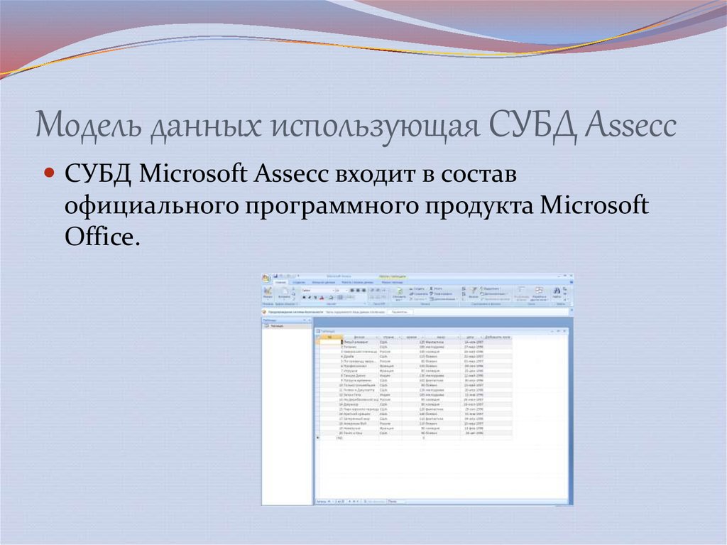 СУБД Microsoft Assecc входит в составофициального программного продукта Microsoft