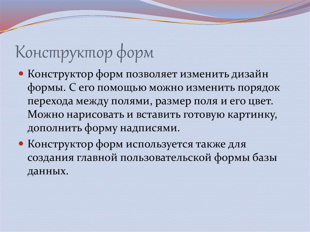 Конструктор форм позволяет изменить дизайнформы. С его помощью можно изменить порядок