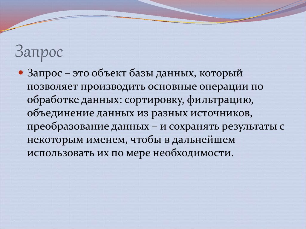 Запрос – это объект базы данных, которыйпозволяет производить основные операции по