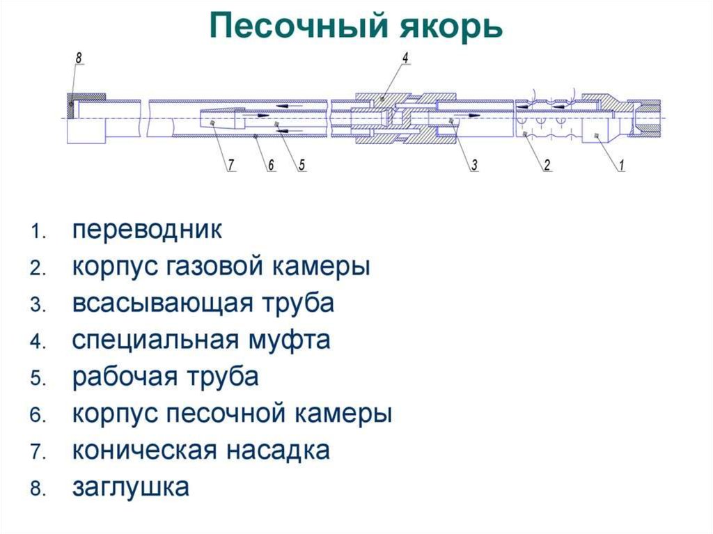 7. Основное назначение песочных якорей состоит в том, чтобы отделить песок от продукции скважины перед поступлением ее на прием