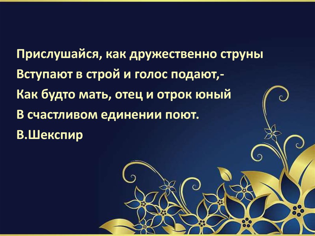 Прислушайся, как дружественно струныВступают в строй и голос подают,Как будто мать, отец и отрок юный