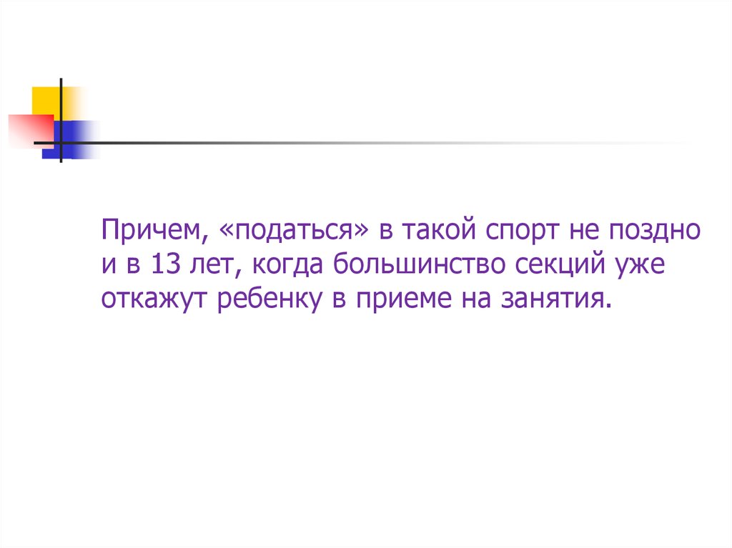 Причем, «податься» в такой спорт не позднои в 13 лет, когда большинство секций уже