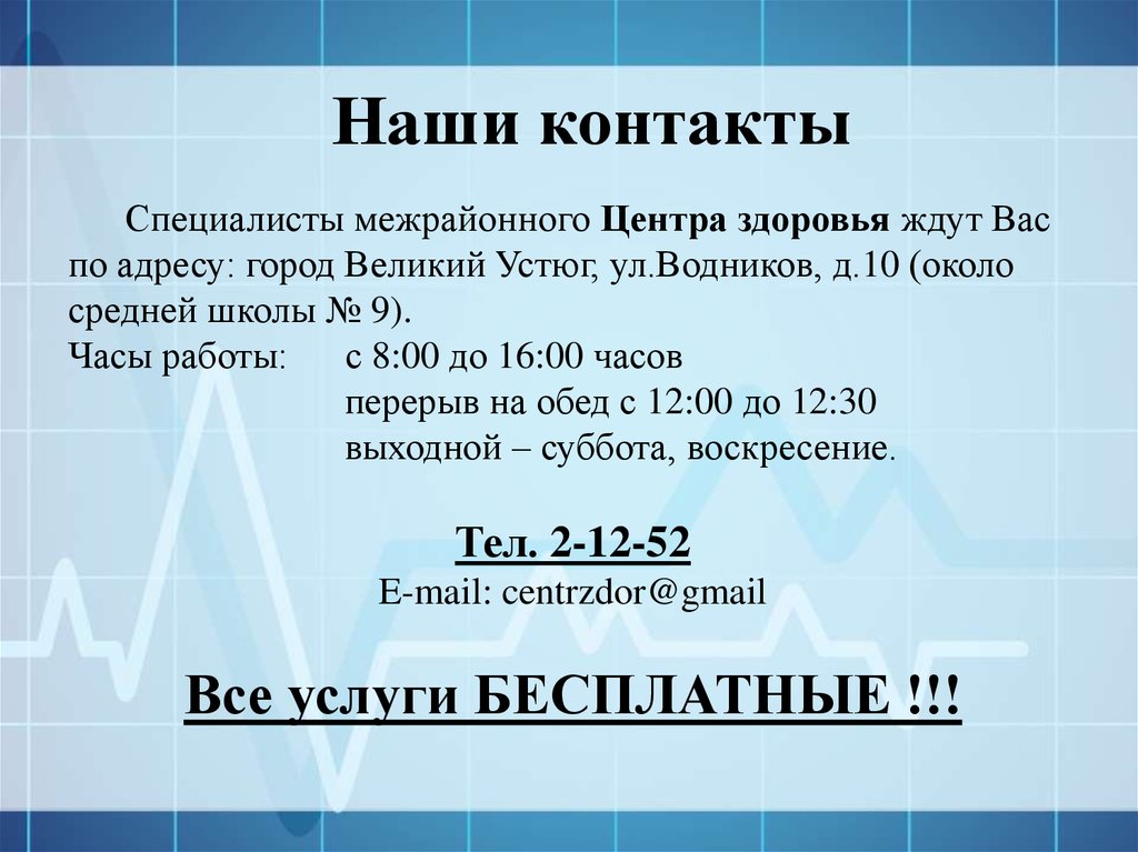 Наши контактыСпециалисты межрайонного Центра здоровья ждут Вас