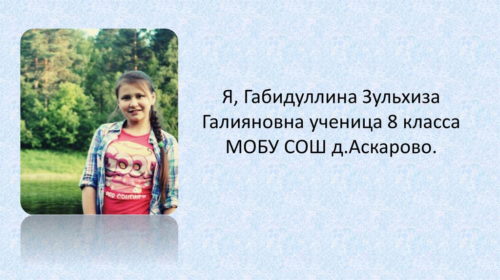 1. Я, Габидуллина Зульхиза Галияновна ученица 8 класса МОБУ СОШ д.Аскарово.