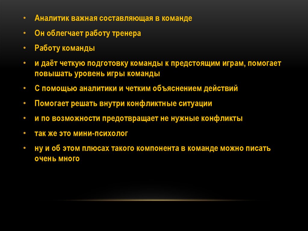 • Аналитик важная составляющая в команде• Он облегчает работу тренера