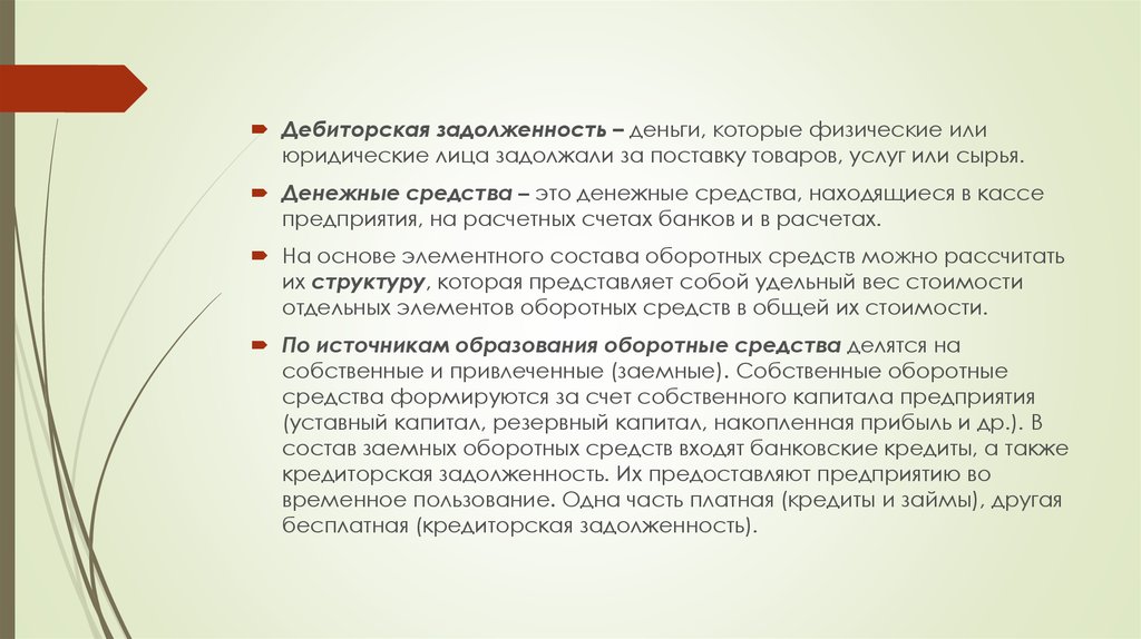 Дебиторская задолженность – деньги, которые физические илиюридические лица задолжали за поставку товаров, услуг или сырья.