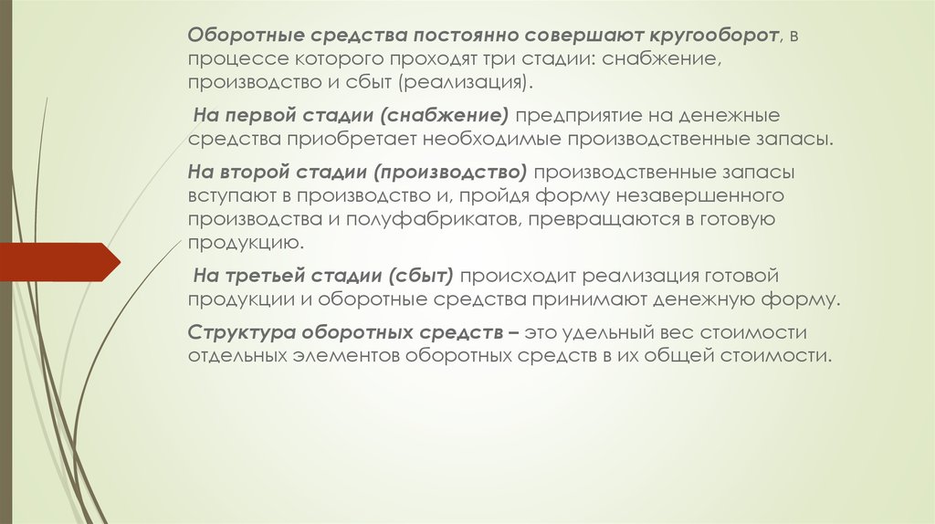 Оборотные средства постоянно совершают кругооборот, впроцессе которого проходят три стадии: снабжение,