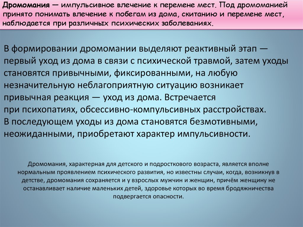 Дромомания — импульсивное влечение к перемене мест. Под дромоманиейпринято понимать влечение к побегам из дома, скитанию и перемене мест,