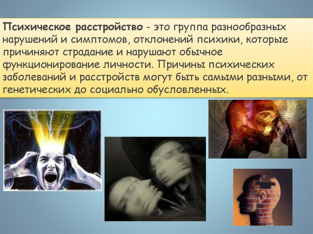Психическое расстройство - это группа разнообразныхнарушений и симптомов, отклонений психики, которые