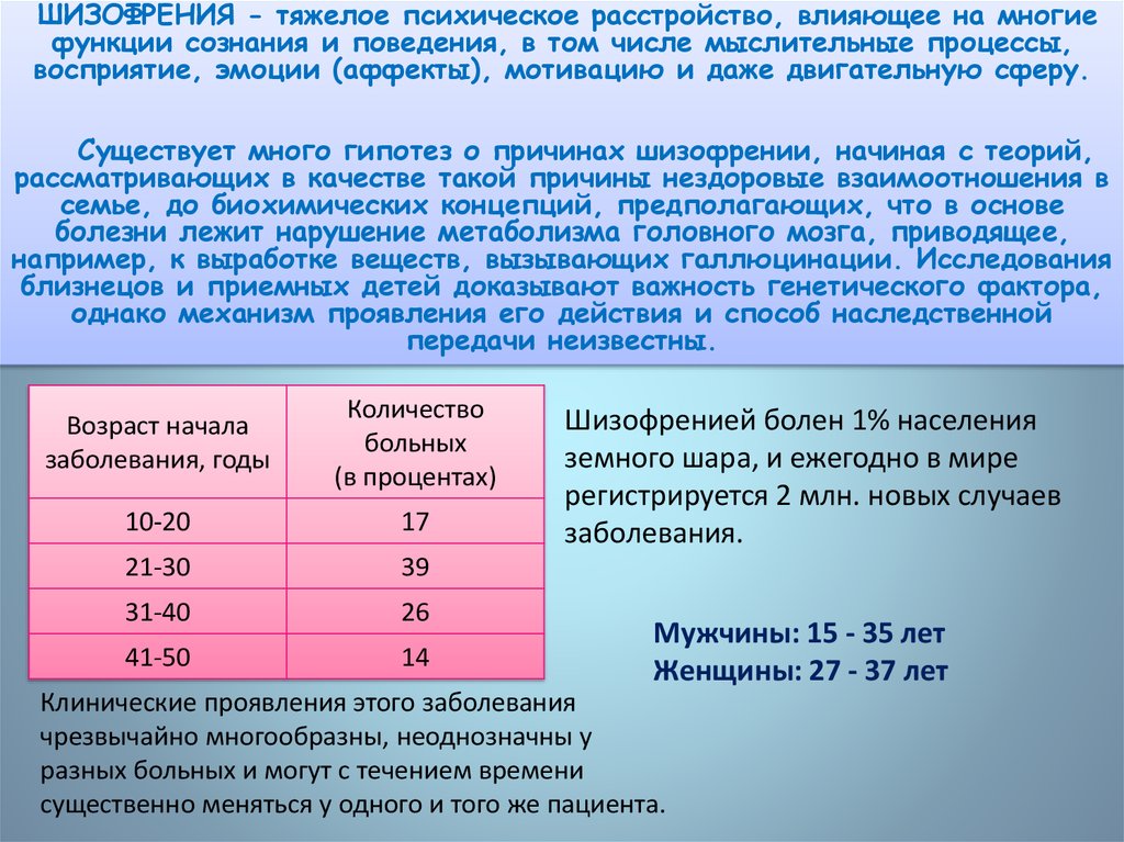 ШИЗОФРЕНИЯ - тяжелое психическое расстройство, влияющее на многиефункции сознания и поведения, в том числе мыслительные процессы,