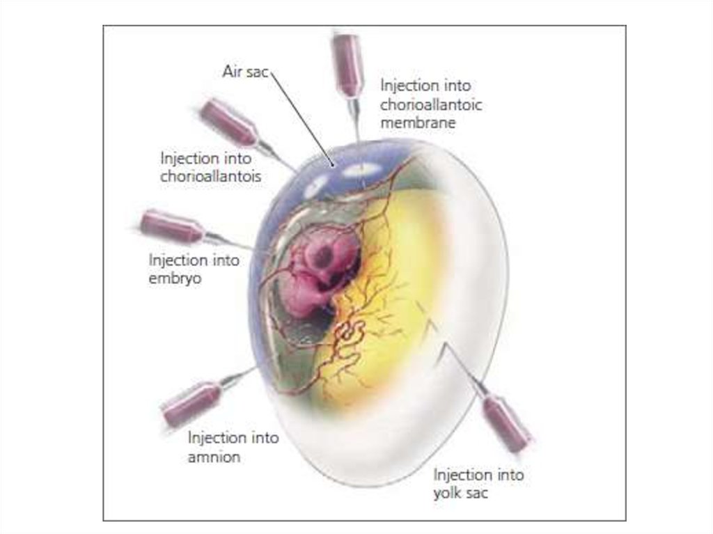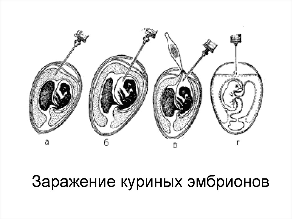 Культивирование вирусов путем зараженияразвивающихся куриных эмбрионов.