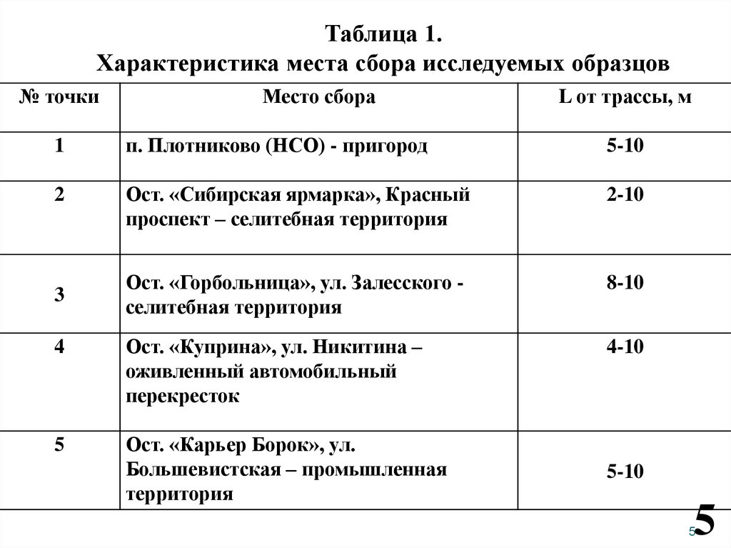 Таблица 1.Характеристика места сбора исследуемых образцов