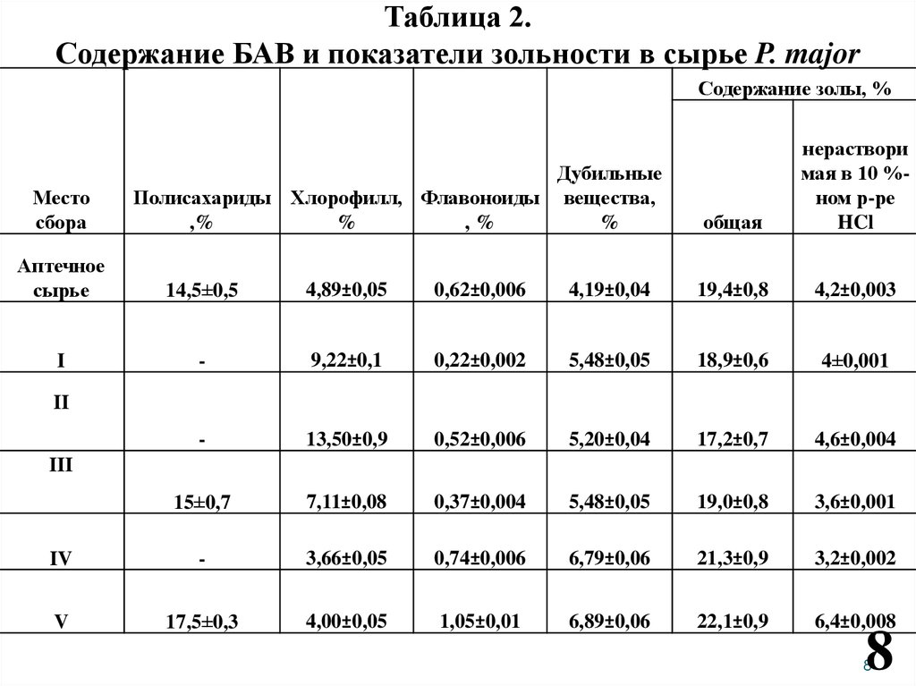 Таблица 2.Содержание БАВ и показатели зольности в сырье P. major
