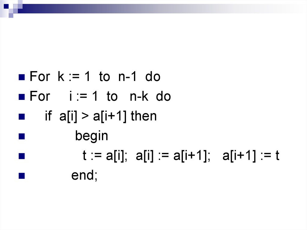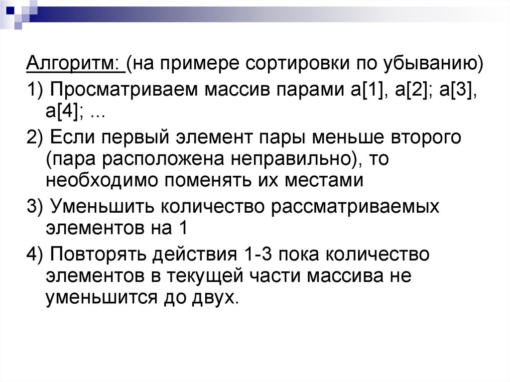 Алгоритм: (на примере сортировки по убыванию)1) Просматриваем массив парами a[1], a[2]; a[3],