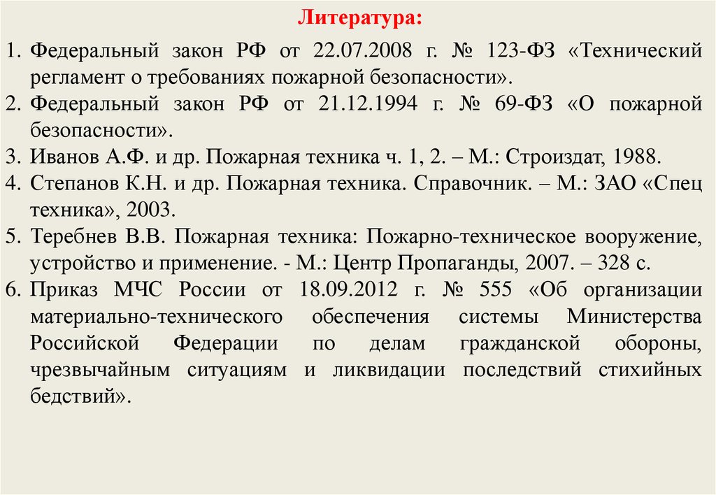 3. Иванов А.Ф. и др. Пожарная техника ч. 1, 2. – М.: Строиздат, 1988.