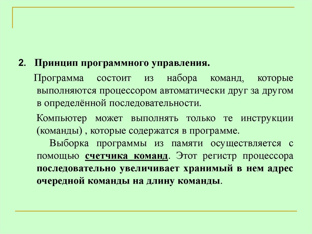 2. Принцип программного управления.Программа состоит из набора команд, которые