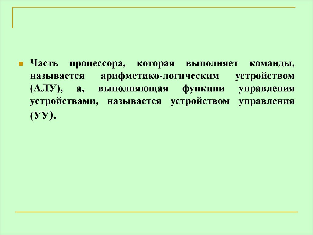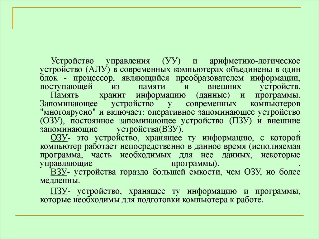 Устройство управления (УУ) и арифметико-логическоеустройство (АЛУ) в современных компьютерах объединены в один