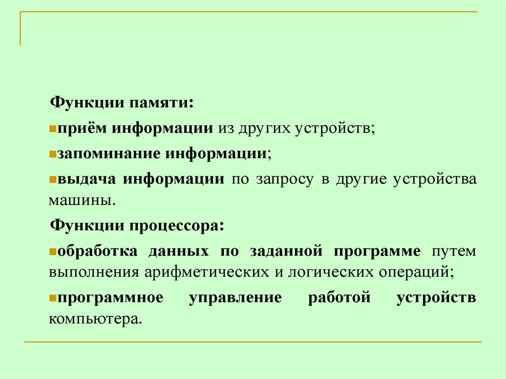 Функции памяти:приём информации из других устройств;
