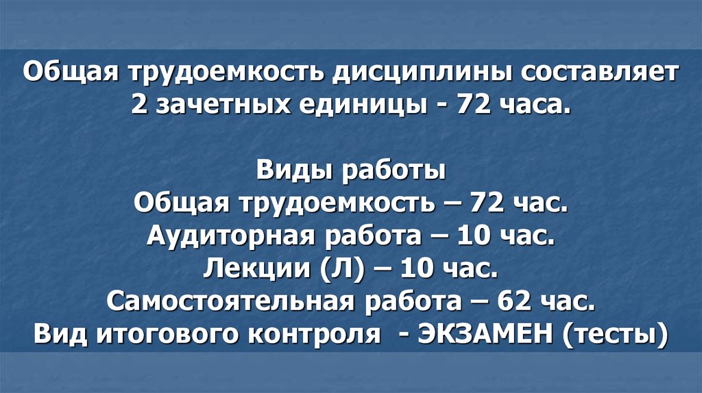 Общая трудоемкость дисциплины составляет2 зачетных единицы - 72 часа.