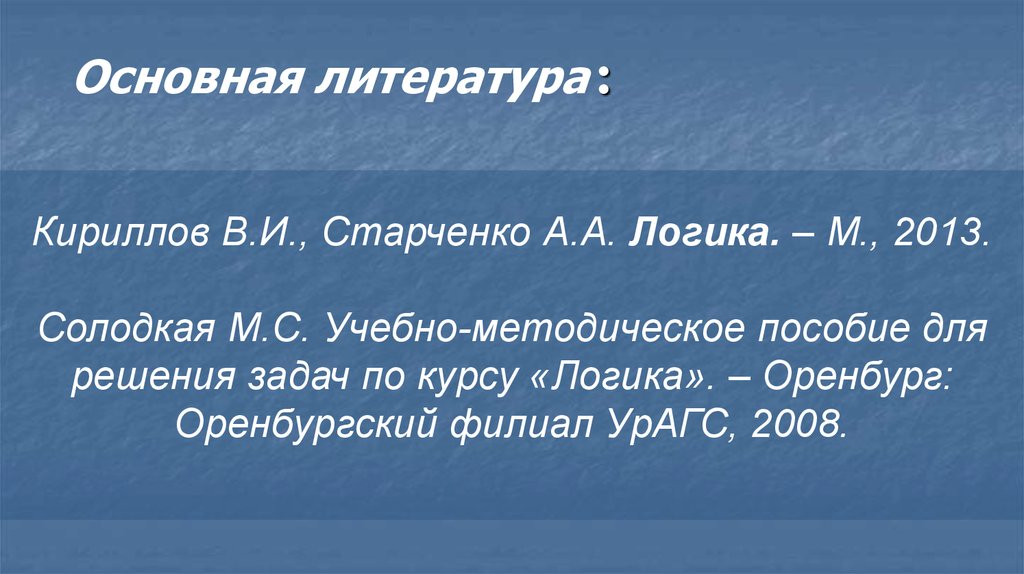Основная литература :Кириллов В.И., Старченко А.А. Логика. – М., 2013.