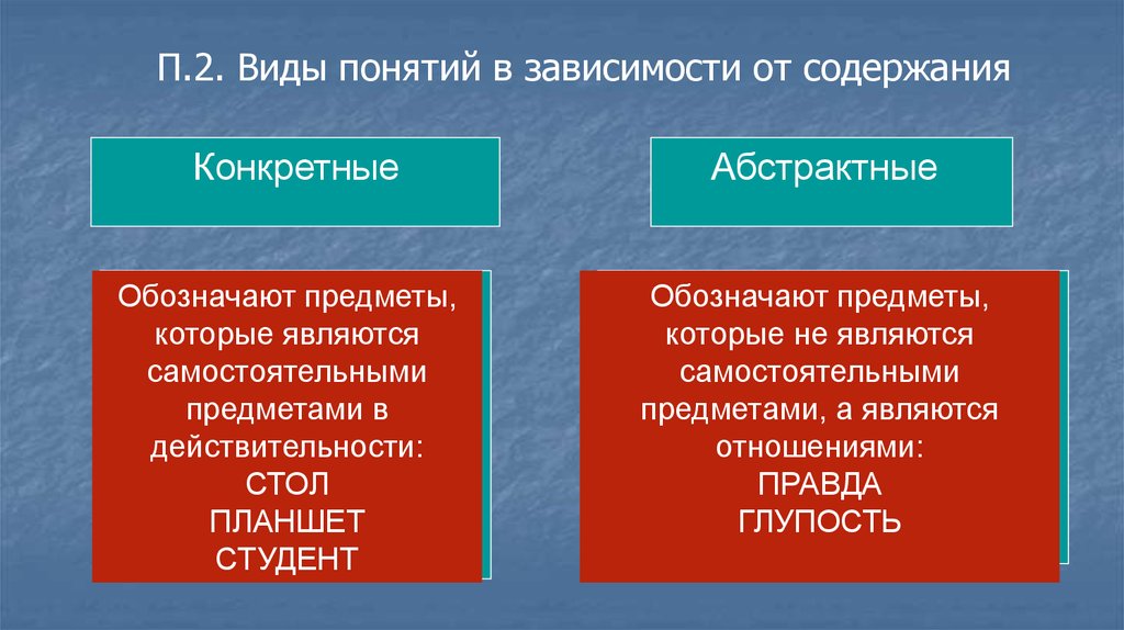 П.2. Виды понятий в зависимости от содержанияКонкретные