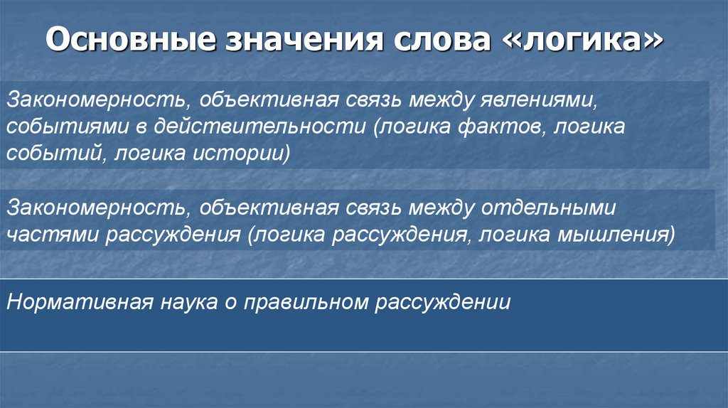 Основные значения слова «логика»Закономерность, объективная связь между явлениями,