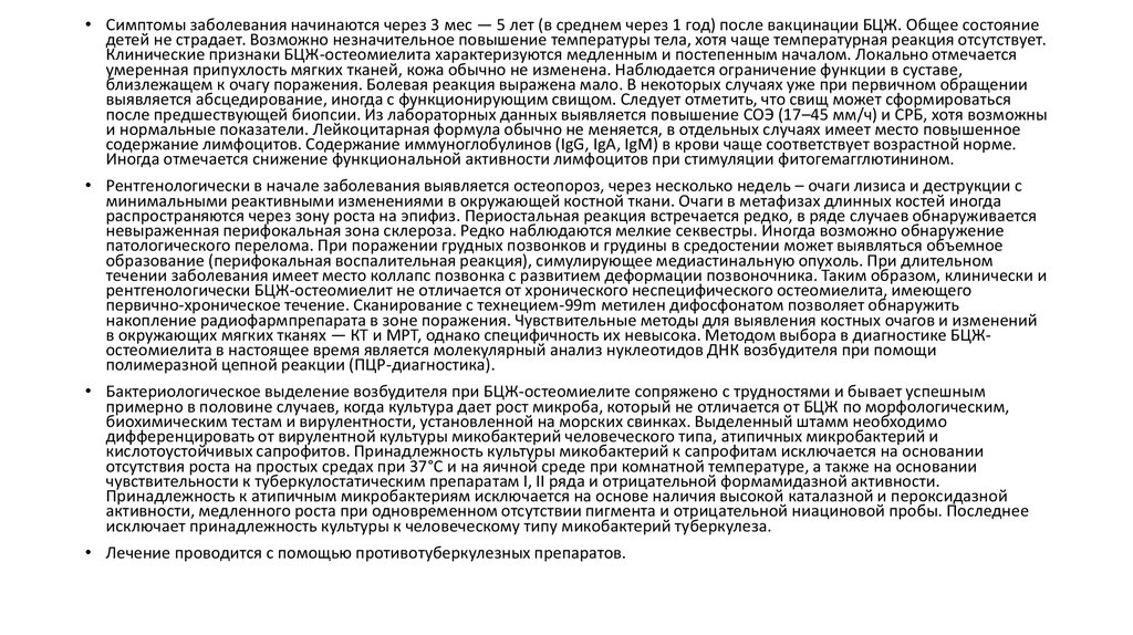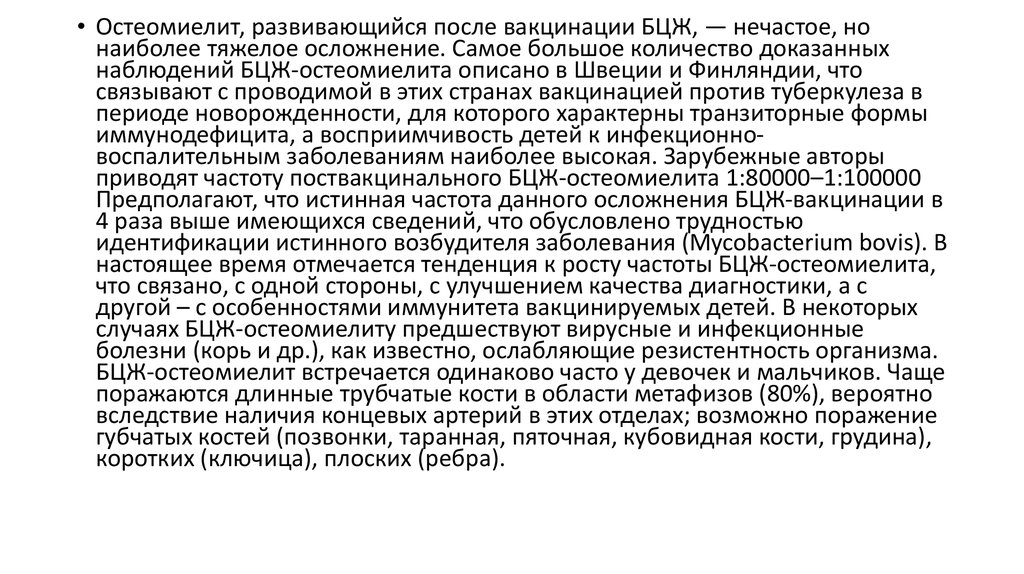 • Остеомиелит, развивающийся после вакцинации БЦЖ, — нечастое, нонаиболее тяжелое осложнение. Самое большое количество доказанных