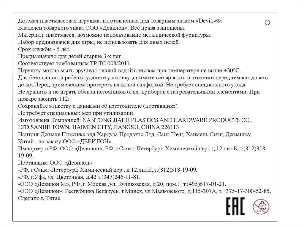 -ООО «Девилон М», РФ ,г. Москва ,ул. Куликовская, д.20, пом.1, т.(495)617-01-21.