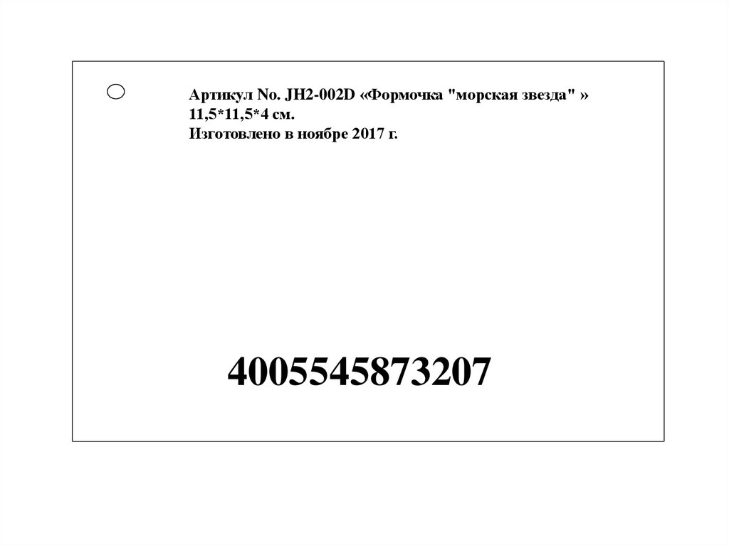 Артикул No. JH2-024A «Формочка "крабик"» 9*6*2 см.Изготовлено в ноябре 2017 г.