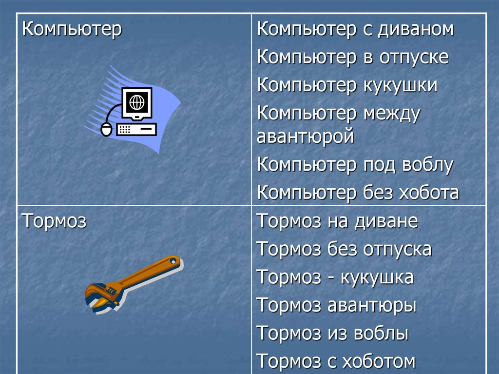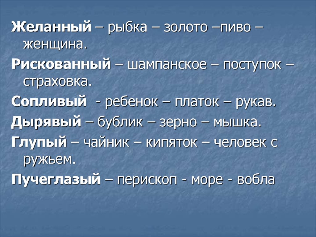 6. Отпуск – желанный – короткий – административный Хобот – длинный – серый – сопливый Авантюра – грубая – смелая – рискованная