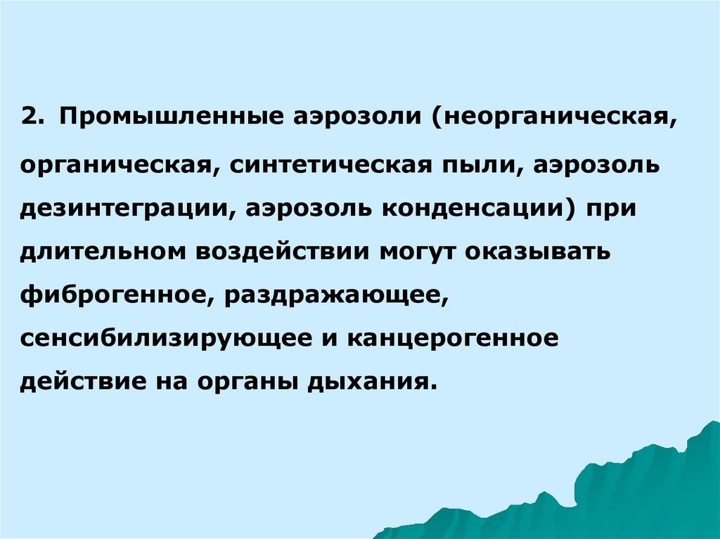 2. Промышленные аэрозоли (неорганическая,органическая, синтетическая пыли, аэрозоль