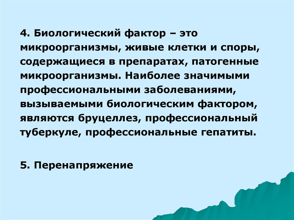 4. Биологический фактор – этомикроорганизмы, живые клетки и споры,
