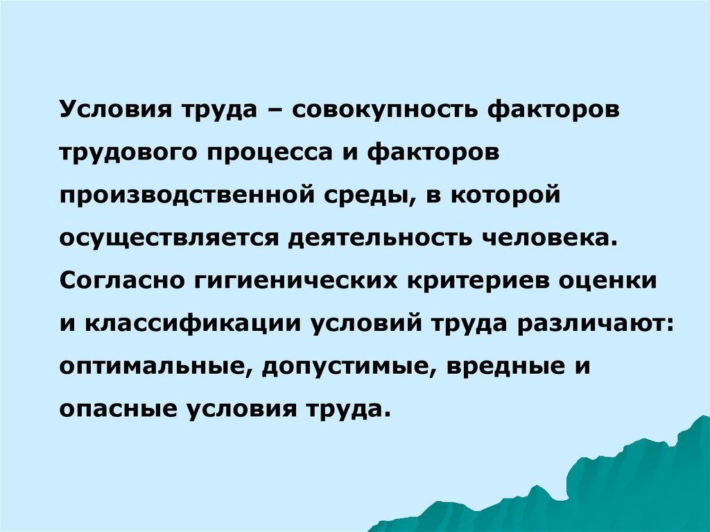 Условия труда – совокупность факторовтрудового процесса и факторов