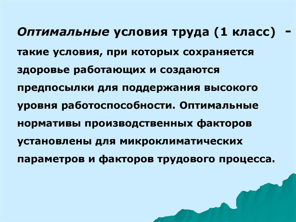 Оптимальные условия труда (1 класс) такие условия, при которых сохраняетсяздоровье работающих и создаются