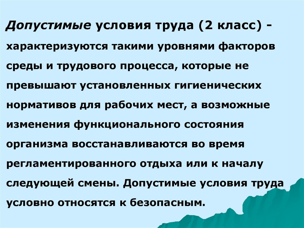 Допустимые условия труда (2 класс) характеризуются такими уровнями факторовсреды и трудового процесса, которые не