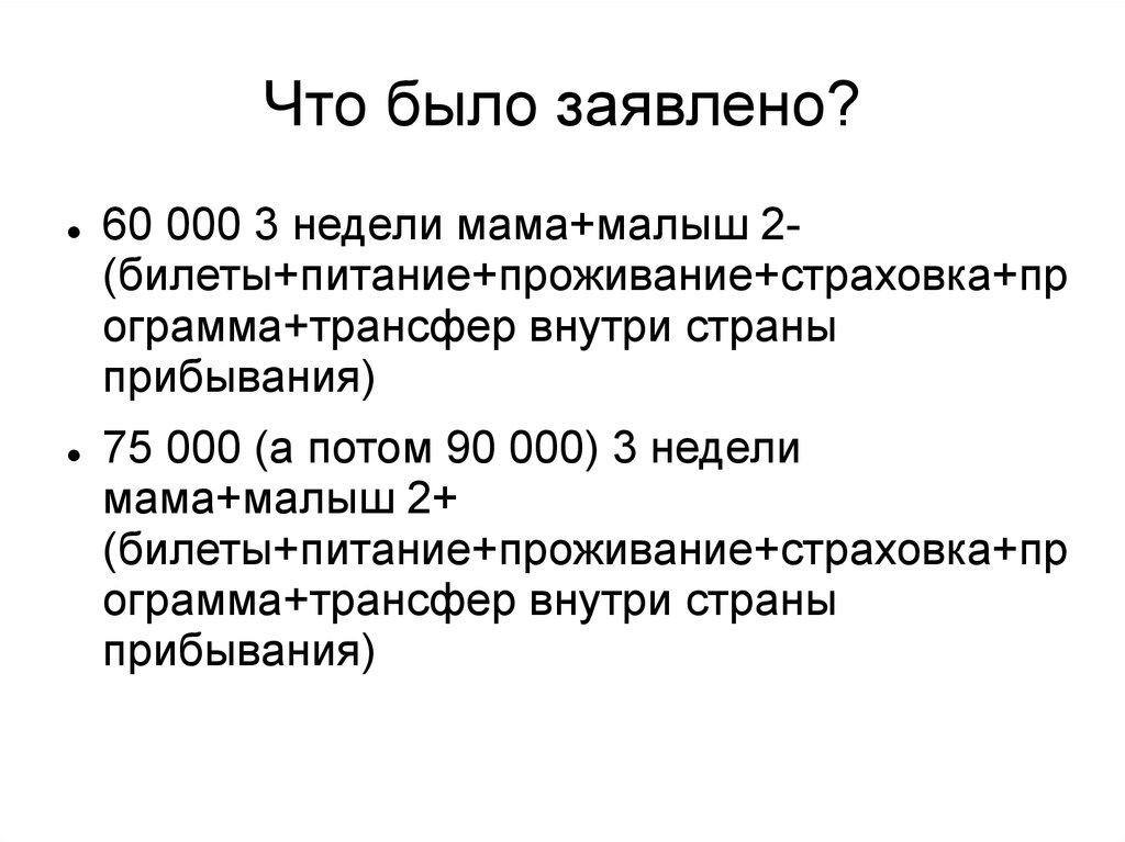 Что было заявлено?60 000 3 недели мама+малыш 2(билеты+питание+проживание+страховка+пр