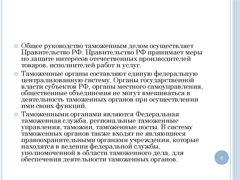 Общее руководство таможенным делом осуществляетПравительство РФ. Правительство РФ принимает меры
