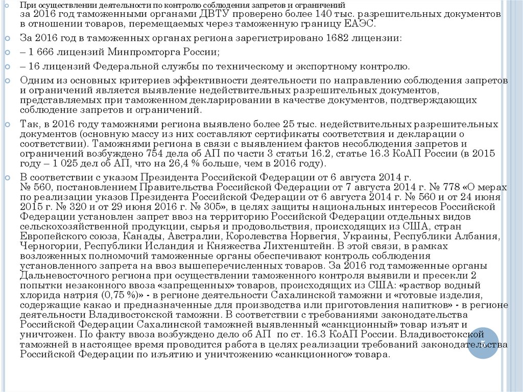 установленного запрета на ввоз вышеперечисленных товаров. За 2016 год таможенные органы