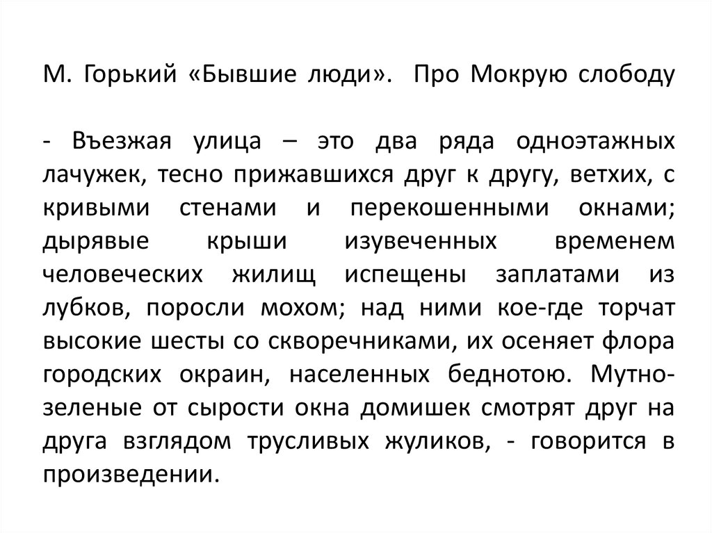 М. Горький «Бывшие люди». Про Мокрую слободу- Въезжая улица – это два ряда одноэтажных