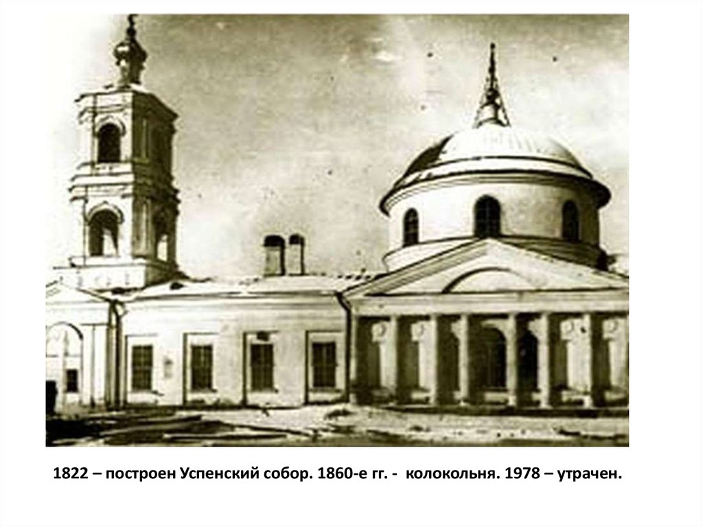 1822 – построен Успенский собор. 1860-е гг. - колокольня. 1978 – утрачен.7.
