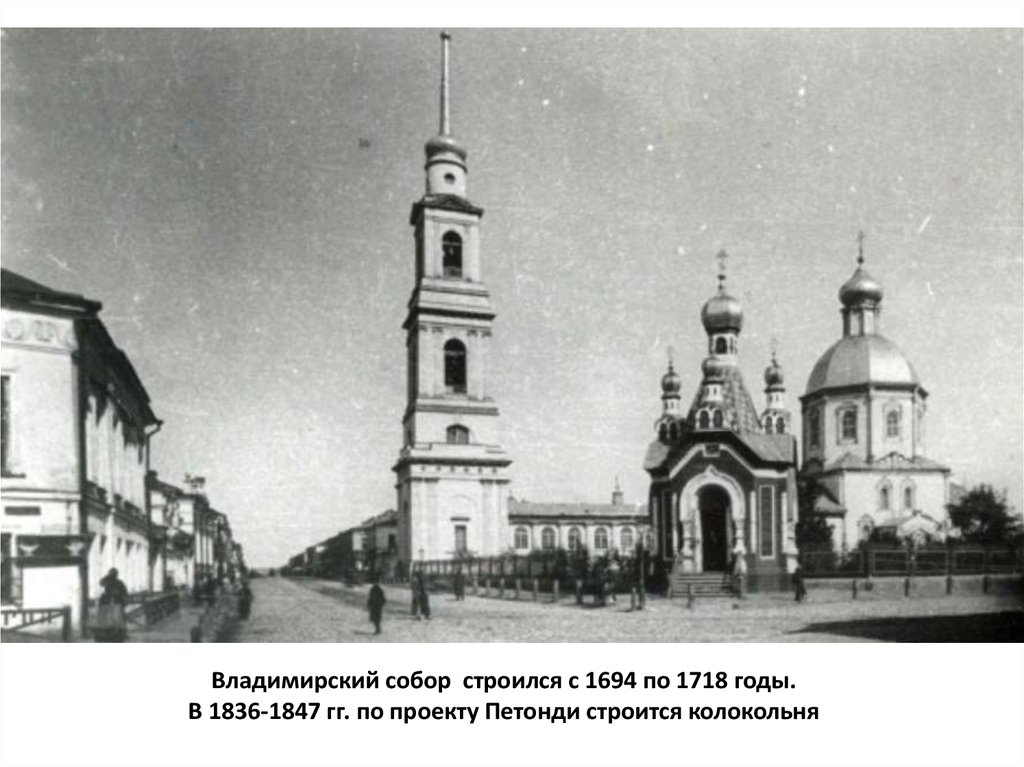 Владимирский собор строился с 1694 по 1718 годы.В 1836-1847 гг. по проекту Петонди строится колокольня