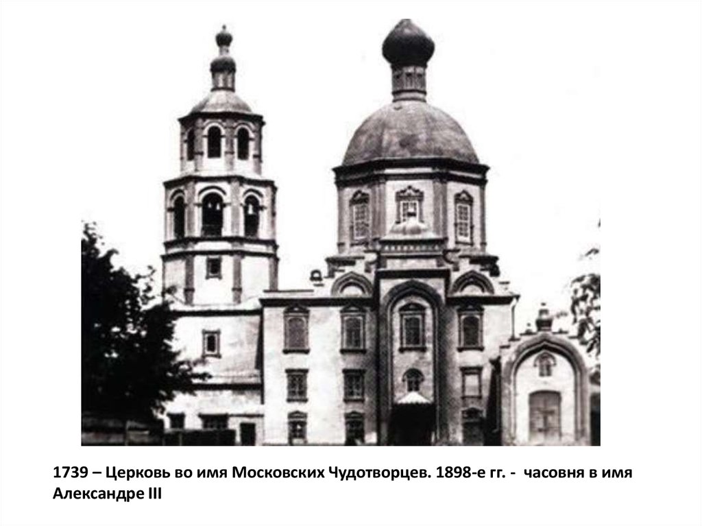 1739 – Церковь во имя Московских Чудотворцев. 1898-е гг. - часовня в имяАлександре III