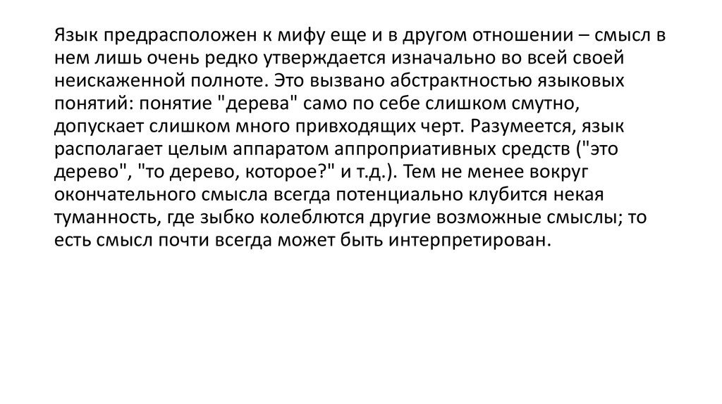 Язык прeдpaсположeн к мифу еще и в другом отношении – смысл внем лишь очень редко утверждается изначально во всей своей