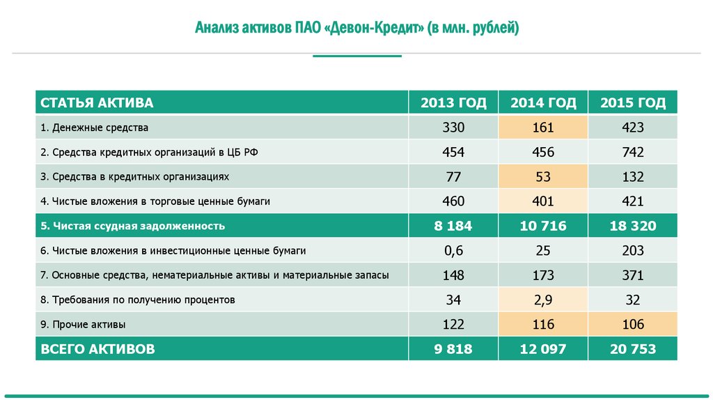 Анализ активов ПАО «Девон-Кредит» (в млн. рублей)СТАТЬЯ АКТИВА